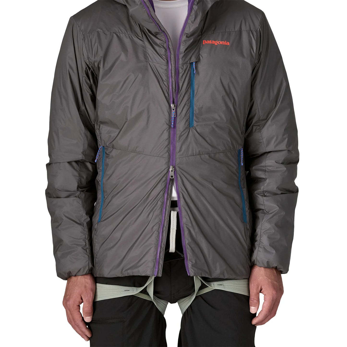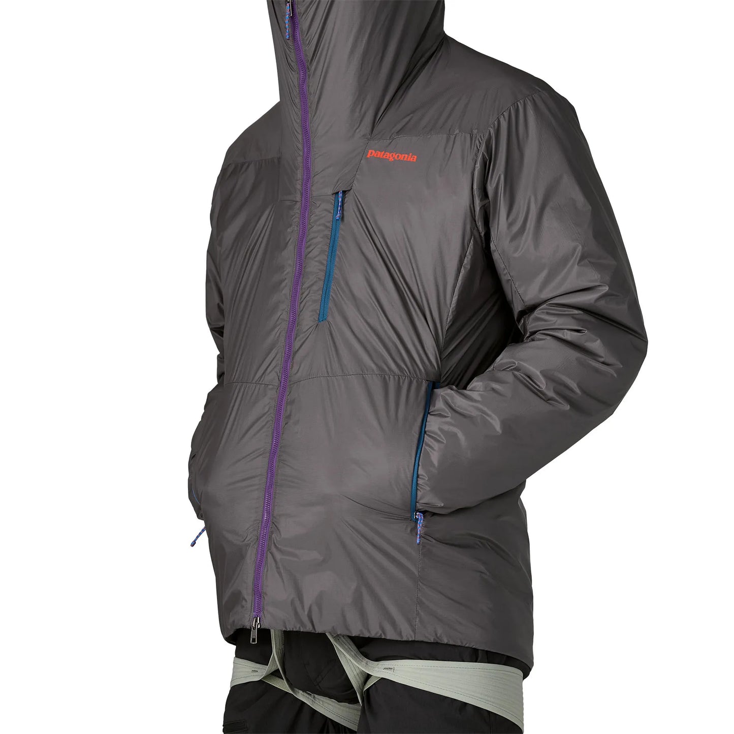 - 可容納登山頭盔的帽兜,具備後側單拉繩調節與前側彈性綁邊。